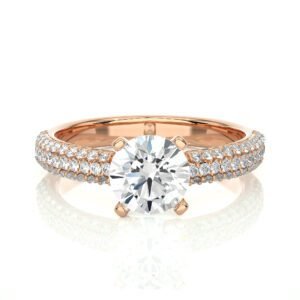This stunning solitaire ring features a brilliant central diamond elegantly set in a pave diamond band. The intricate setting showcases a halo of shimmering micro-set diamonds, enhancing the ring’s ...